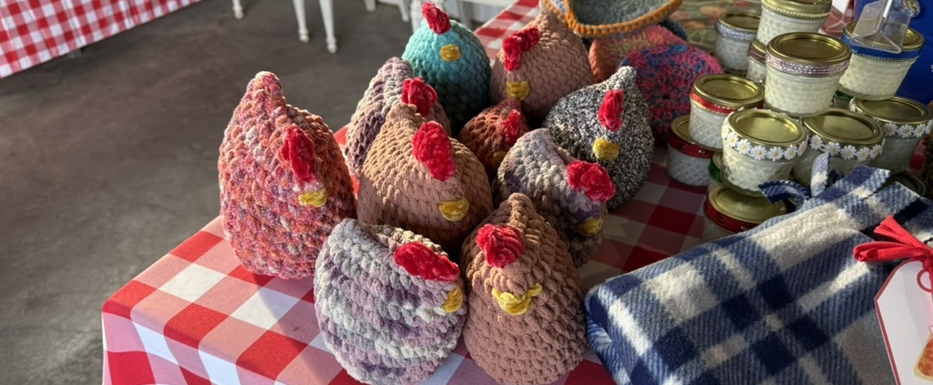 This morning we went to Prairie Elder Care for their Fall Festival. Kristin donated her crochet masterpieces: Worry Worms, Chickens, Scarves (some are fleece cut by her mom). Delaina played handpans. A couple of small business owners brought goods to sell. We all got a chance to bid on art created by the residents. Everyone had a great time eating donuts and drinking cider.
